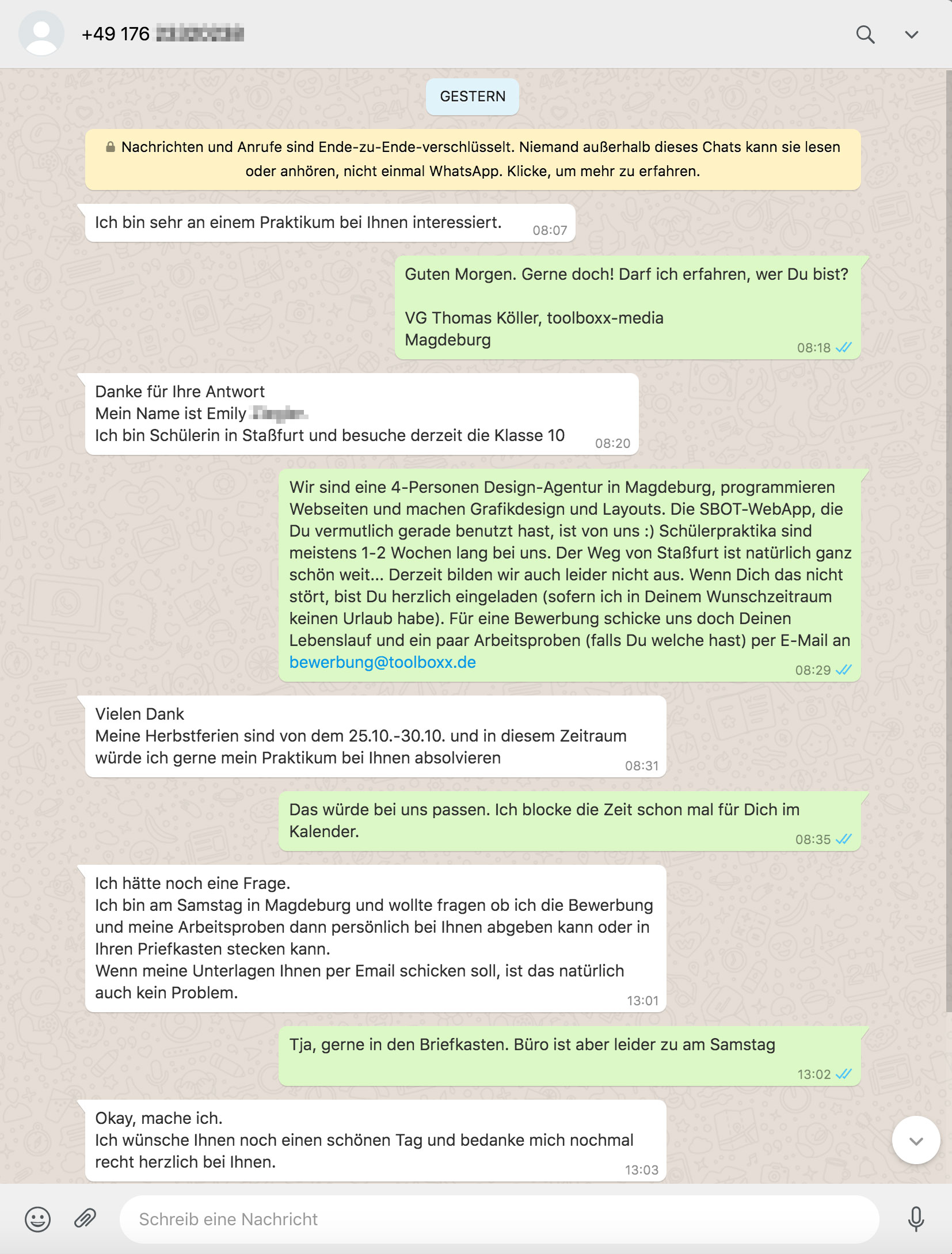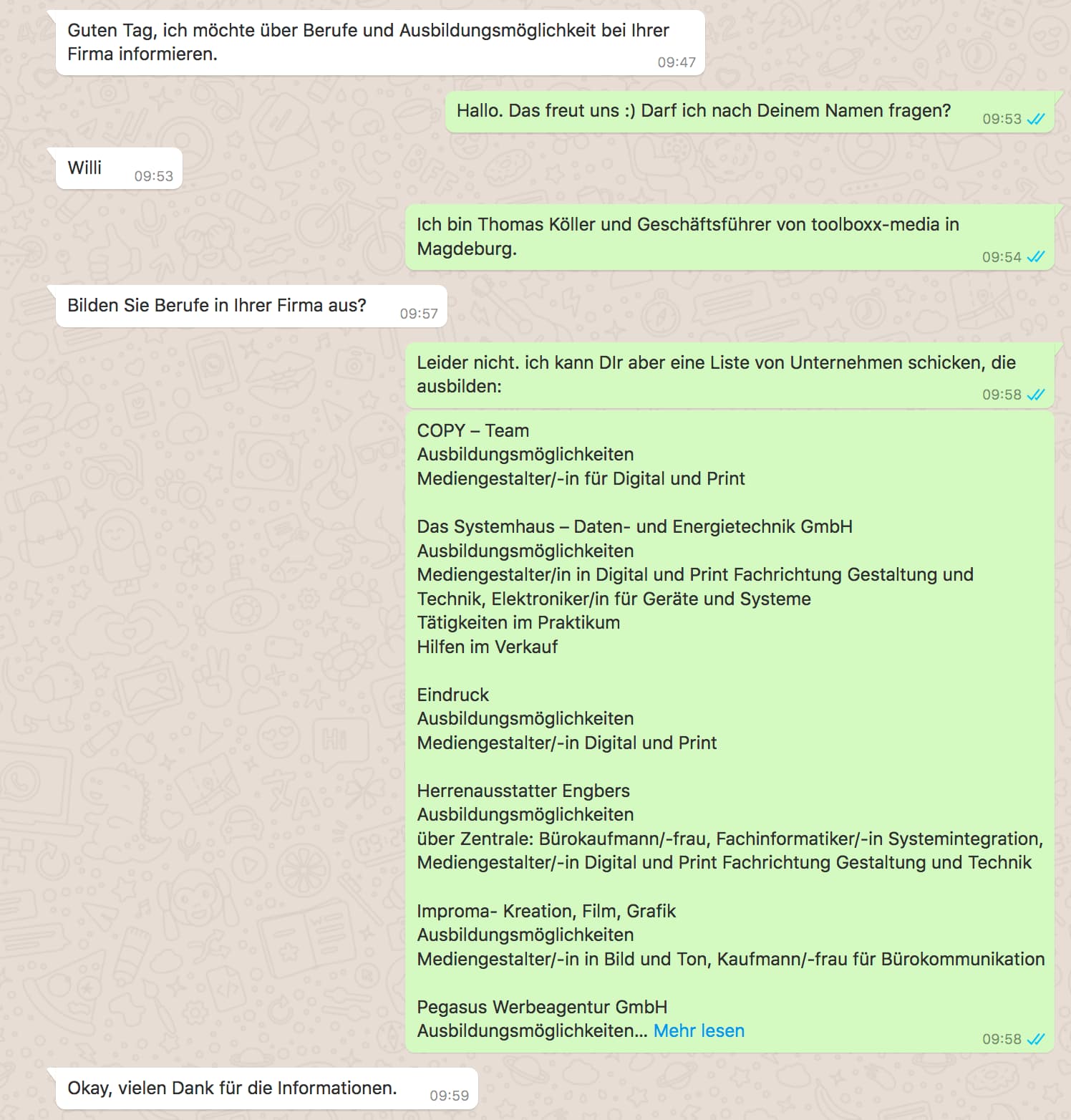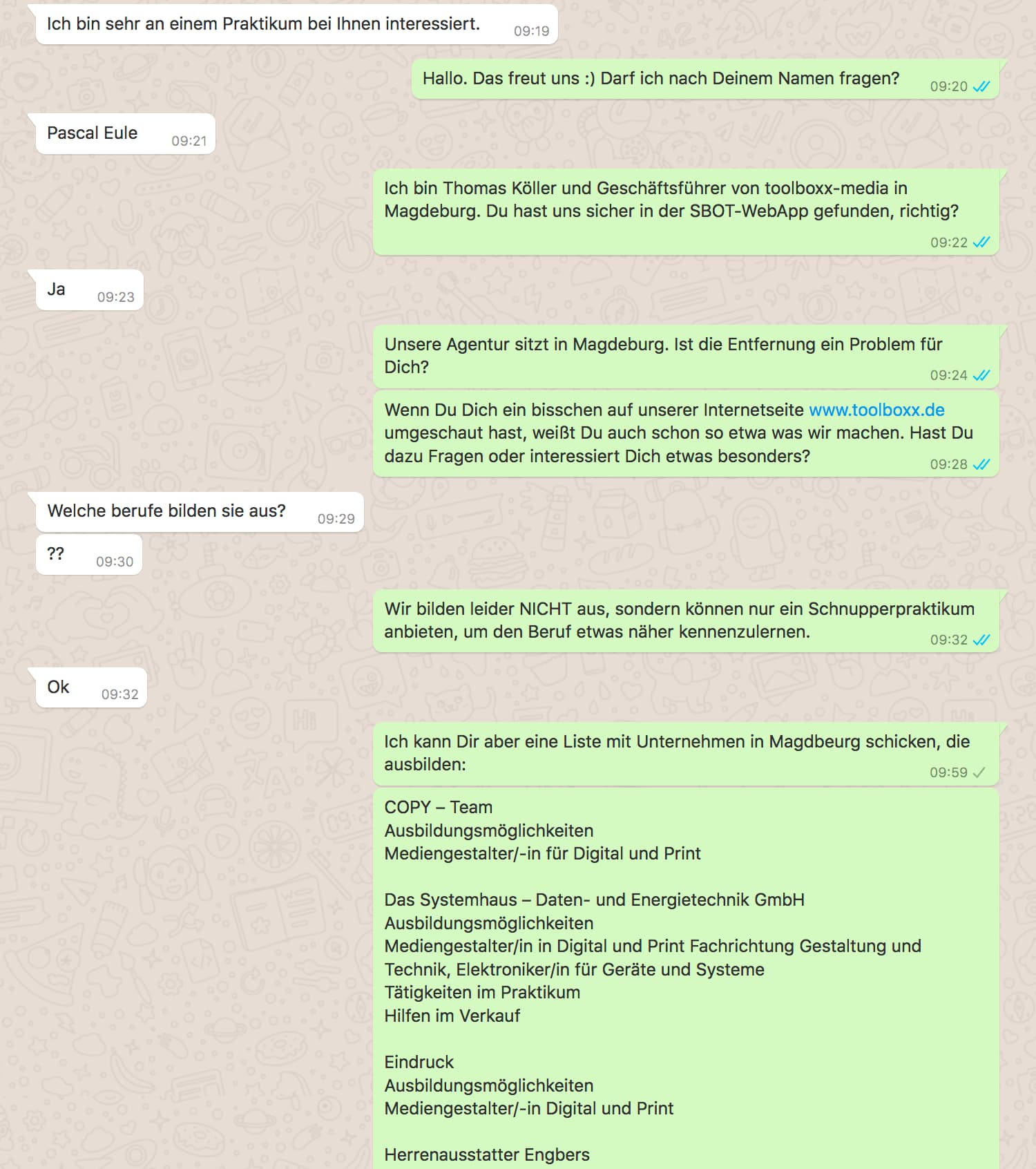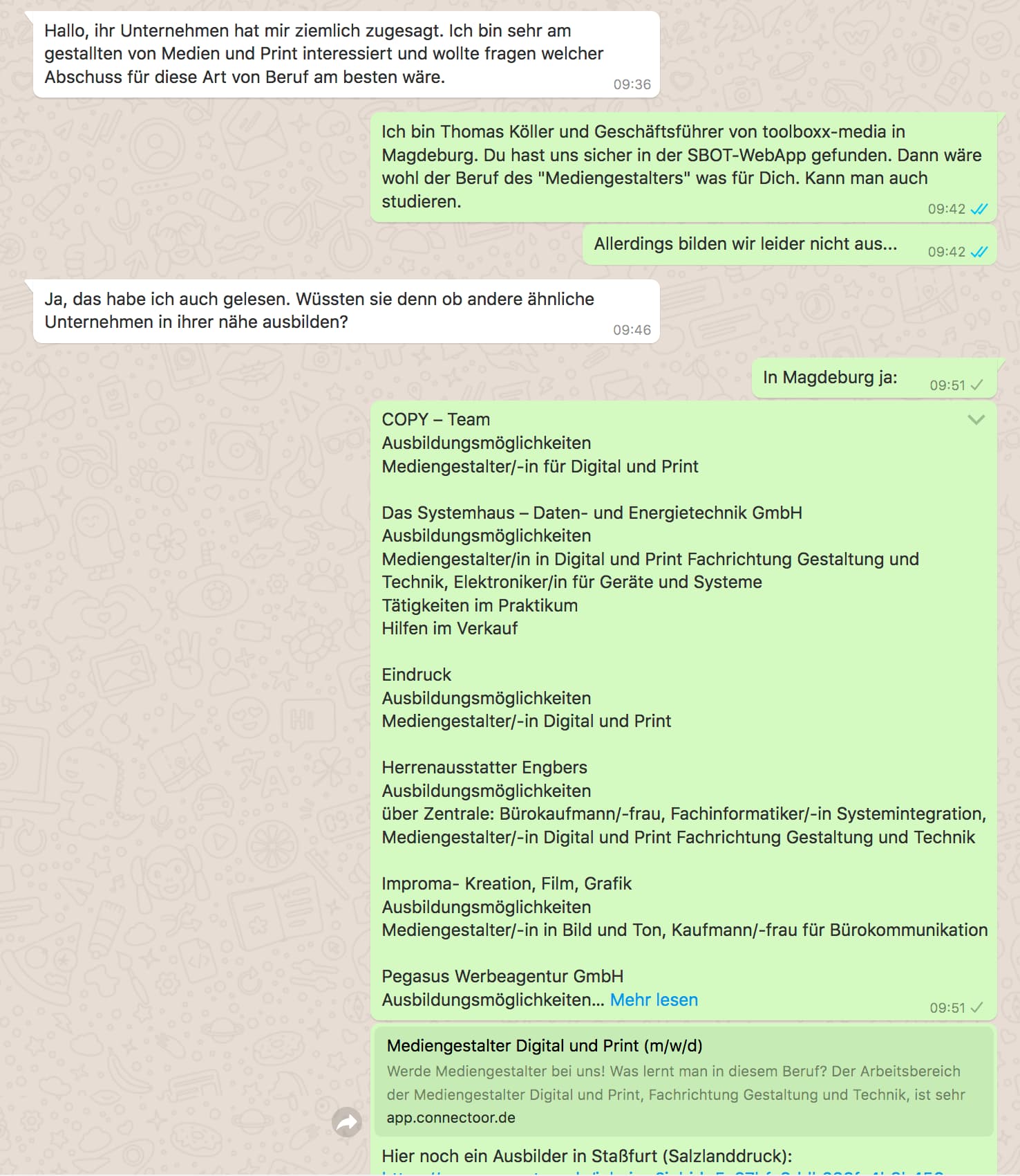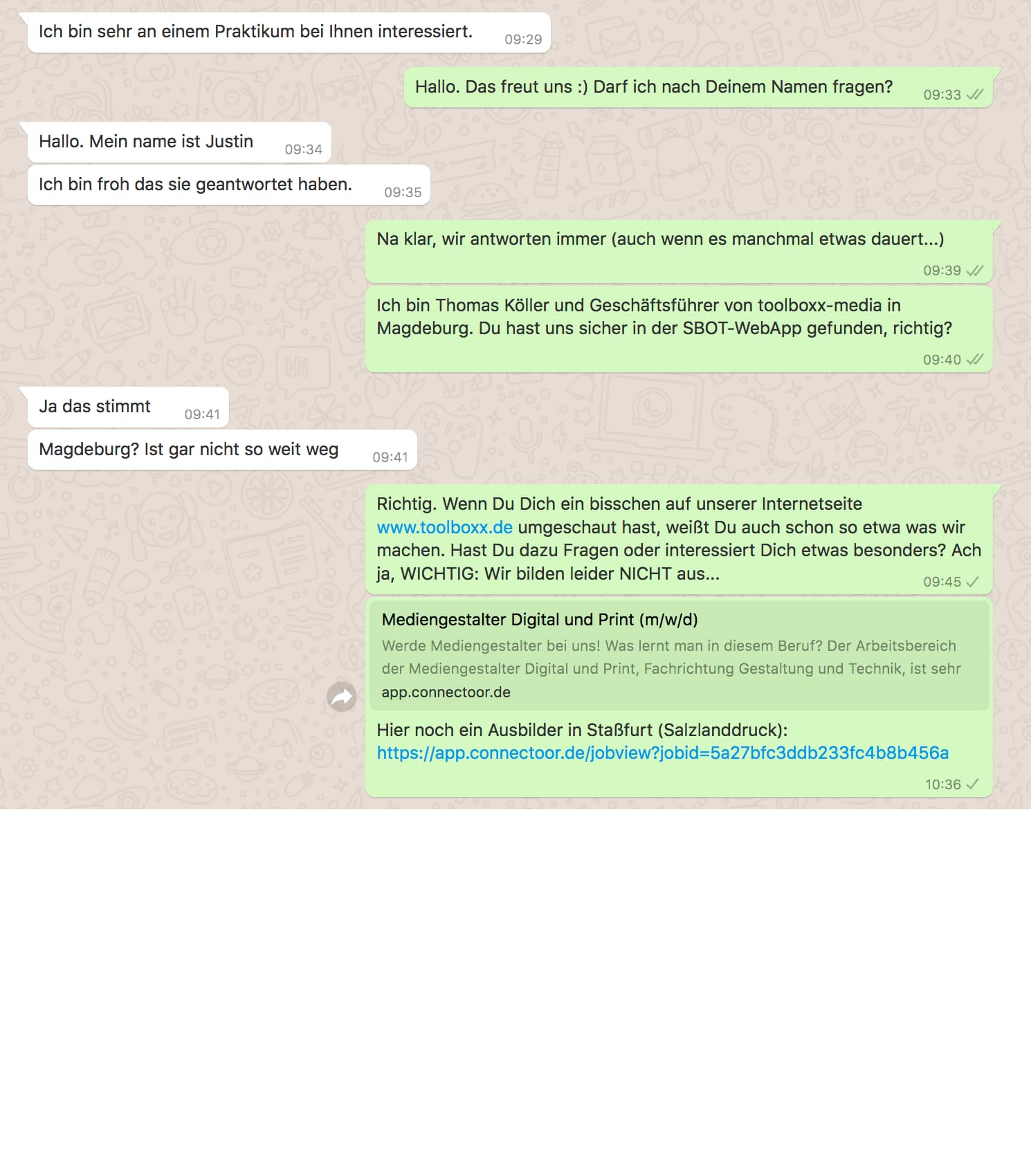 • Bereitschaft einer/mehrerer Auszubildenden, welche das Unternehmen bzw. ihren Ausbildungsplatz präsentieren möchten